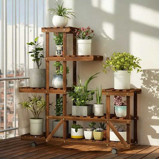 Estantería de Madera con Ruedas para Plantas – 6 Niveles Jardín Móvil