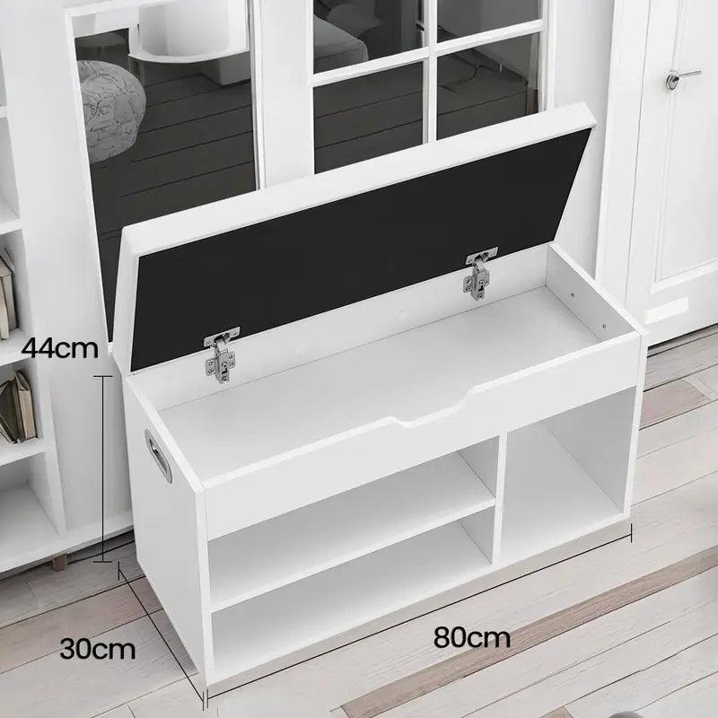 ✔️ Medidas: 80 cm de ancho x 30 cm de fondo x 44 cm de alto. ✔️ Diseño 3 en 1: asiento acolchado, compartimento superior con tapa y estantes para calzado. ✔️ Espacio suficiente para zapatos, botas y accesorios. ✔️ Fabricado en madera resistente, acabado en color blanco minimalista. ✔️ Perfecto para la entrada, dormitorio o vestidor.