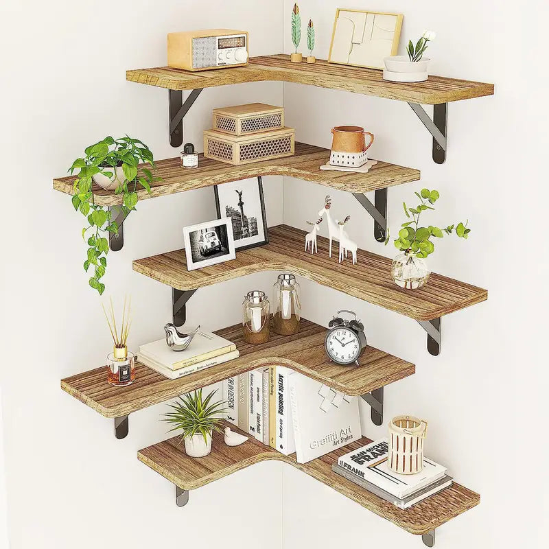 ✔️ Set de 5 estantes en forma de esquina, perfectos para cocina, baño, sala o dormitorio. ✔️ Medidas de cada balda: 40,8 cm de ancho x 28,9 cm de fondo x 1,5 cm de grosor. ✔️ Incluye soportes metálicos resistentes, tornillos, tacos y nivel para instalación sencilla. ✔️ Fabricados en madera duradera con acabado rústico, combinan estilo y practicidad. ✔️ Ideales para libros, plantas, especias, utensilios de cocina, decoración y más.